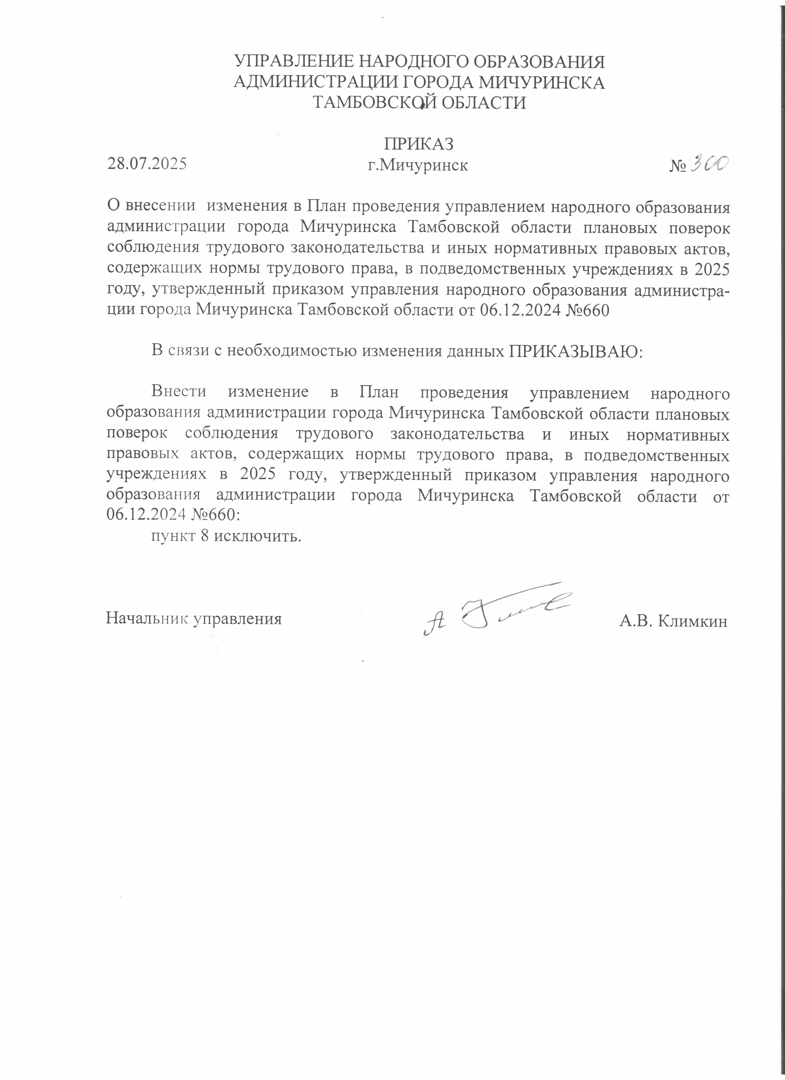 Просмотров: 3172 Планирование деятельности Приказ управления народного образования администрации города Мичуринска Тамбовской области от 28.07.2025 № 300 "О внесении изменения в План проведения управлением народного образования администрации города Мичуринска Тамбовской области плановых поверок соблюдения трудового законодательства и иных нормативных правовых актов, содержащих нормы трудового права, в подведомственных учреждениях в 2025 году, утвержденный приказом управления народного образования администрации города Мичуринска Тамбовской области от 06.12.2024 №660" Подписано электронной подписью Начальник управления народного образования администрации г. Мичуринска, Климкин А.В., сформирован уникальный программный ключ: 00 E1 4C 61 06 C2 78 FC E9 Приказ управления народного образования администрации города Мичуринска Тамбовской области от 16.12.2024 №682 "О внесении изменений в План проведения управлением народного образования администрации города Мичуринска Тамбовской области плановых проверок соблюдения трудового законодательства и иных нормативных правовых актов, содержащих нормы трудового права, в подведомственных учреждениях в 2025 году, утвержденный риказом управления народного образования администрации города Мичуринска Тамбовской области от 06.15.2024 №660" Подписано электронной подписью Начальник управления народного образования администрации г. Мичуринска, Климкин А.В., сформирован уникальный программный ключ: 00 E1 4C 61 06 C2 78 FC E9 Приказ управления народного образования администрации города Мичуринска Тамбовской области от 06.12.2024 №660 "Об утверждении Плана проведения управлением народного образования администрации города Мичуринска Тамбовской области плановых поверок соблюдения трудового законодательства и иных нормативных правовых актов, содержащих нормы трудового права, в подведомственных учреждениях в 2025 году" Подписано электронной подписью Начальник управления народного образования администрации г. Мичуринска, Климкин А.В., сформирован уникальный программный ключ: 00 E1 4C 61 06 C2 78 FC E9 Приказ управления народного образования администрации города Мичуринска Тамбовской области от 06.12.2023 "Об утверждении Плана проведения управлением народного образования администрации города Мичуринска Тамбовской области плановых поверок соблюдения трудового законодательства и иных нормативных правовых актов, содержащих нормы трудового права, в подведомственных учреждениях в 2024 году" Подписано электронной подписью 11.01.2023 Начальник управления народного образования администрации г. Мичуринска, Климкин А.В., сформирован уникальный программный ключ: 00 E1 4C 61 06 C2 78 FC E9 Приказ управления народного образования администрации города Мичуринска Тамбовской области от 09.12.2022 "Об утверждении Плана проведения управлением народного образования администрации города Мичуринска Тамбовской области плановых поверок соблюдения трудового законодательства и иных нормативных правовых актов, содержащих нормы трудового права, в подведомственных учреждениях в 2023 году" Подписано электронной подписью 26.04.2022 Начальник управления народного образования администрации г. Мичуринска, Климкин А.В., сформирован уникальный программный ключ: 00 E1 4C 61 06 C2 78 FC E9 Приказ управления народного образования администрации города Мичуринска Тамбовской области от 25.04.2022 №2