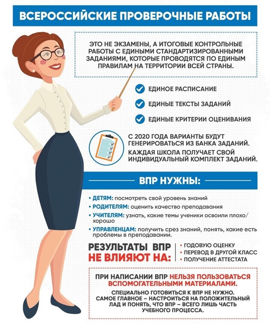 ВПР не стоит бояться, к ним не нужно специально готовиться, нанимать репетиторов. По результатам ВПР не принимается никаких решений, влияющих на дальнейшую судьбу ребенка, получение аттестата, перевод в следующий класс, поступление в вуз.